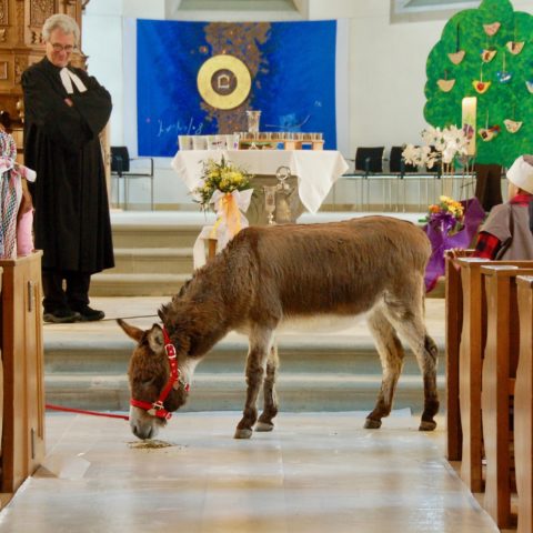 Der Esel Pinocchio, geführt von einer Jüngerin und einem Jünger, ging zügigen Schrittes voran, während Jesus und seine weiteren Jüngerinnen und Jüngern folgten. Die Gemeindemitglieder legten ihre Palmwedel auf den Weg und begleiteten den Zug mit lautem „Ho-ho-hosianna!“ Der Einzug führte vom Kirchenpark durch den Haupteingang und das Kirchenschiff und endete vor der Treppe, die zum Taufbecken führt. Während des nächsten Liedes war Pinocchio noch Gast im Gottesdienst, dann verliess er mit seiner Besitzerin Esther Burkhard die Kirche via Seitenausgang.