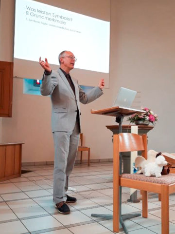 Nach einem Apéro begrüsste Oliver Wupper-Schweers von der Landeskirche die Anwesenden und leitete zum Referat von Pfarrer Tobias Arni über. Tobias Arni ist Fachstellenleiter Religionsunterricht der Evangelischen Landeskirche Thurgau und war elf Jahre lang Chefredaktor der Zeitschrift „Wege zum Kind“. Arni führte am aktuellen Beispiel des Brands der Kathedrale Notre-Dame in Paris ins Thema ein und erläuterte daran die Merkmale von Symbole.
