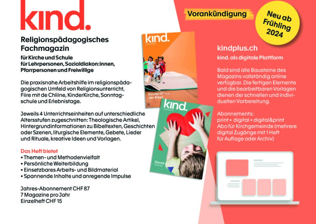Das praxisnahe religionspädagogische Fachmagazin kind. – ehemals «Wege zum Kind» – erhält ab Sommer 2024 neben der Printausgabe eine digitale Plattform, die sich der heutigen digitalen Arbeitsweise der Mitarbeitenden der Kirchgemeinden anpasst und ihnen das Vorbereiten vereinfacht.
