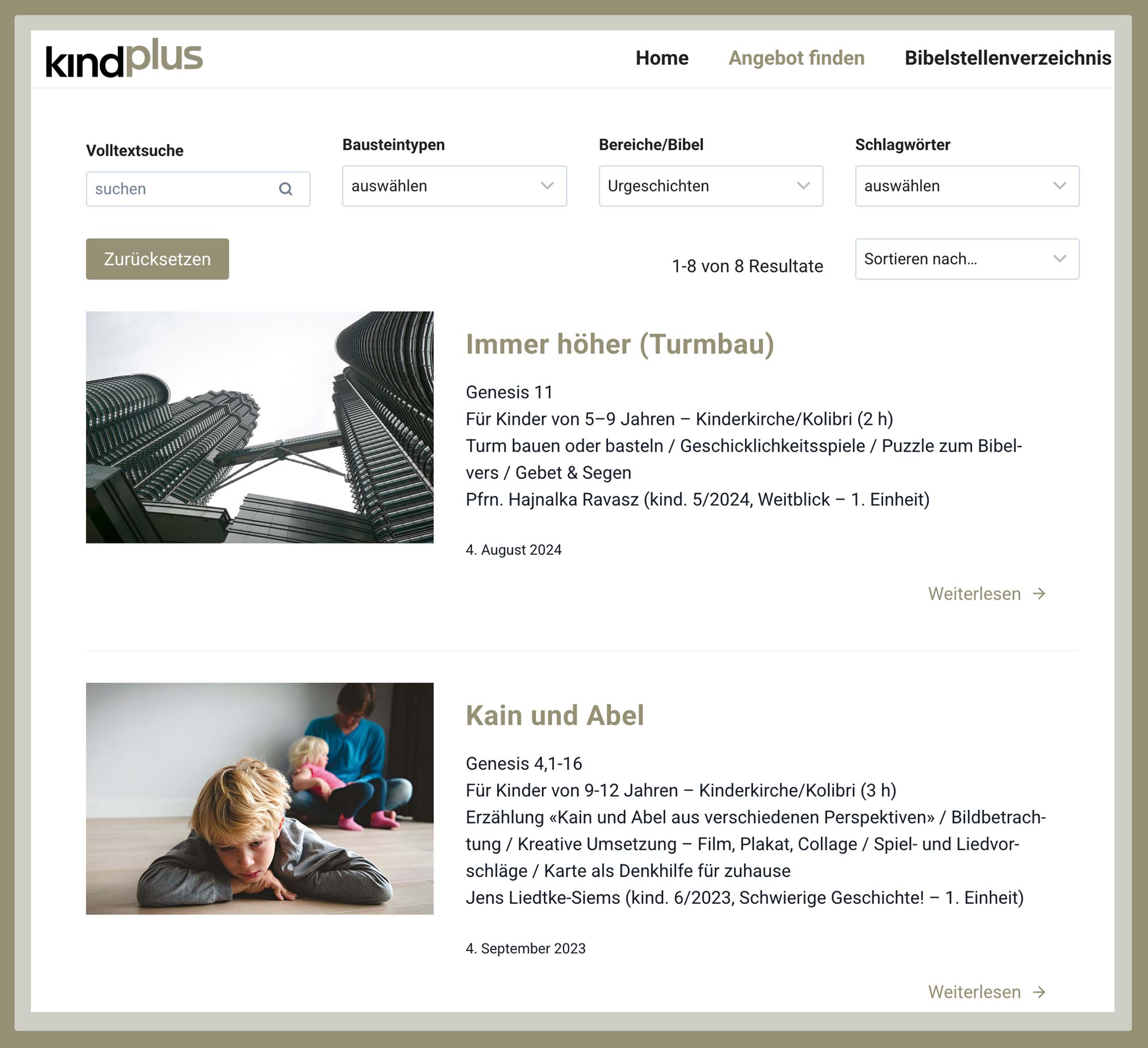 - Filtern nach Zielgruppe, Format, Bausteintyp, Schlagworten und Bibelabschnitten.