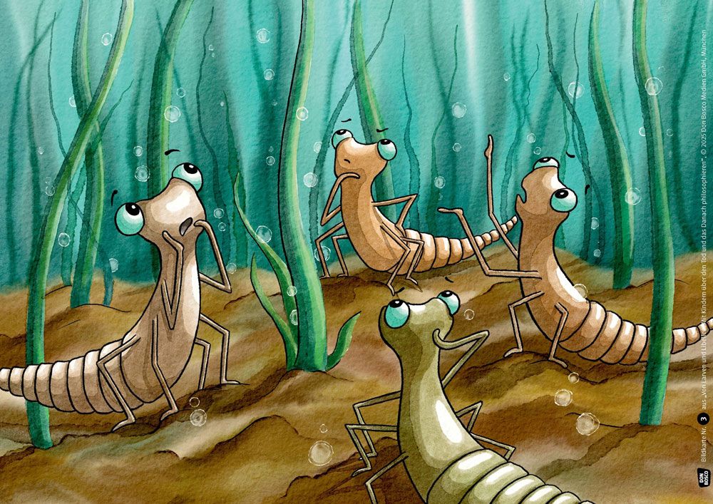 Eine Gruppe von Wasserlarven am Grund des Teichs hat ein vergnügtes Leben: Sie huschen und toben durch den Schlamm. Nur hin und wieder verschwindet eine der Larven nach oben durch die Wasseroberfläche. Was dort wohl vor sich geht? Die Gruppe heckt einen Plan aus, um es herauszufinden, doch das stellt sich als unmöglich heraus …