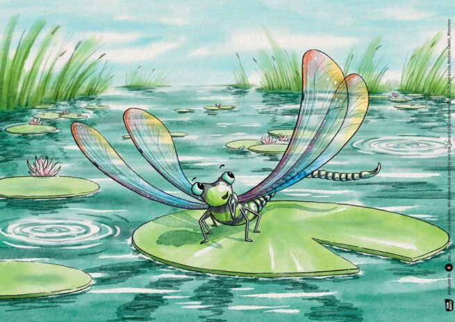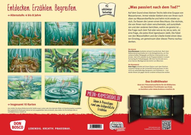 Wohin verschwinden die Larven vom Grund des Teichs plötzlich? Und wieso kann die Libelle nicht zu ihren Freunden zurück? So wie den Teichbewohnern geht es Menschen, die die Grenze zwischen Leben und Tod verstehen wollen. Mit der Geschichte für das Erzähltheater werden Kinder mit dem Phänomen Sterben und Tod vertraut gemacht – ohne Furcht, aber mit vielen Impulsen zum Nachdenken. Das ermöglicht eine kindgerechte Auseinandersetzung mit einem potenziell schwierigen Thema.
