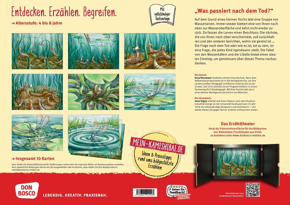 Die englische Fabel “Wasserkäfer und Libelle” als Metapher für das rätselhafte Phänomen des Sterbens gibt es jetzt als Kamishibai-Bildkarten in freier deutscher Nacherzählung. Sie lädt Kinder zu eigenen Überlegungen darüber ein, was nach dem Tod möglicherweise passieren könnte.