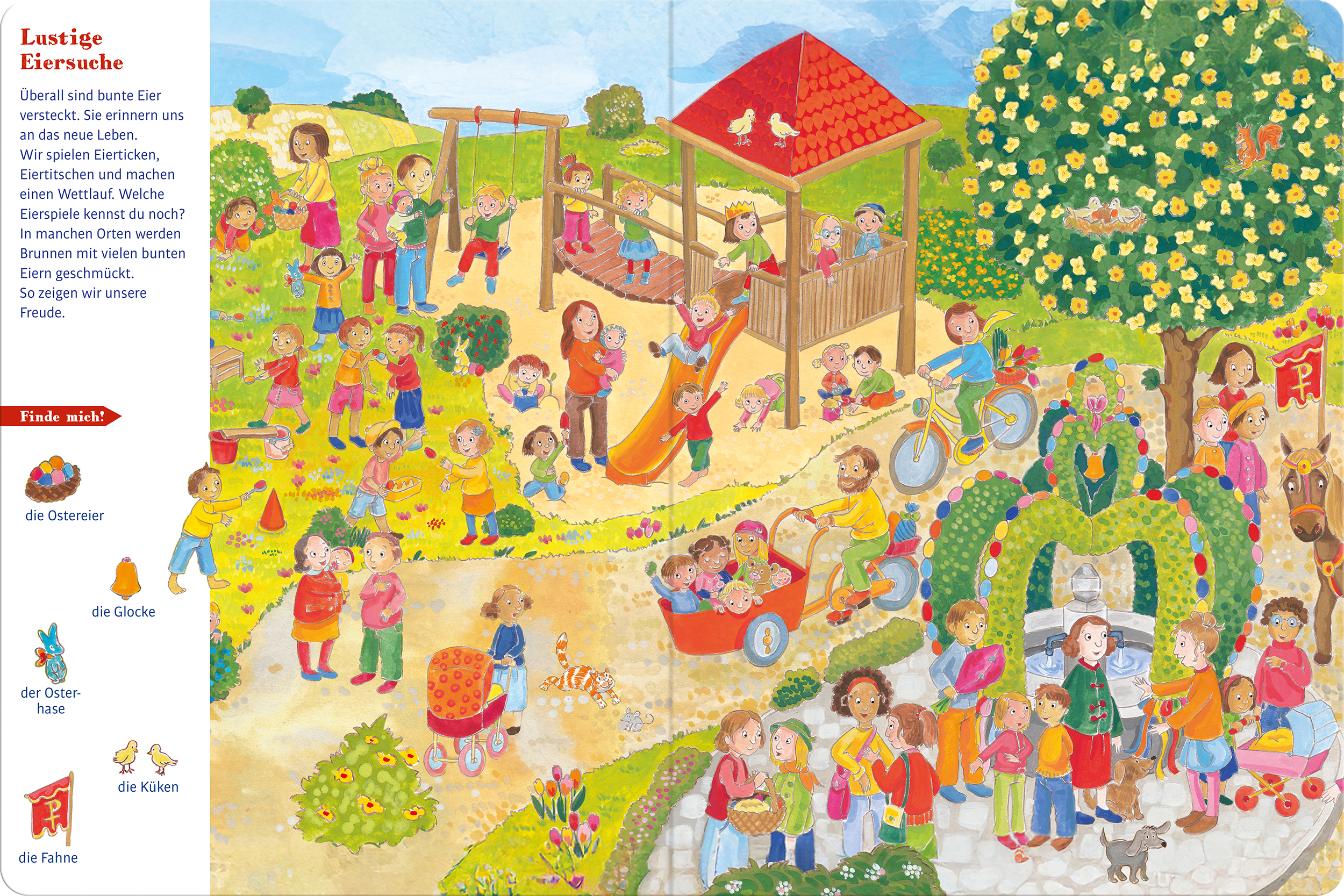 Auf den grossformatigen Wimmelbildern können Kinder kleine Elemente suchen und so spielerisch Konzentration, Aufmerksamkeit und Wahrnehmung trainieren.