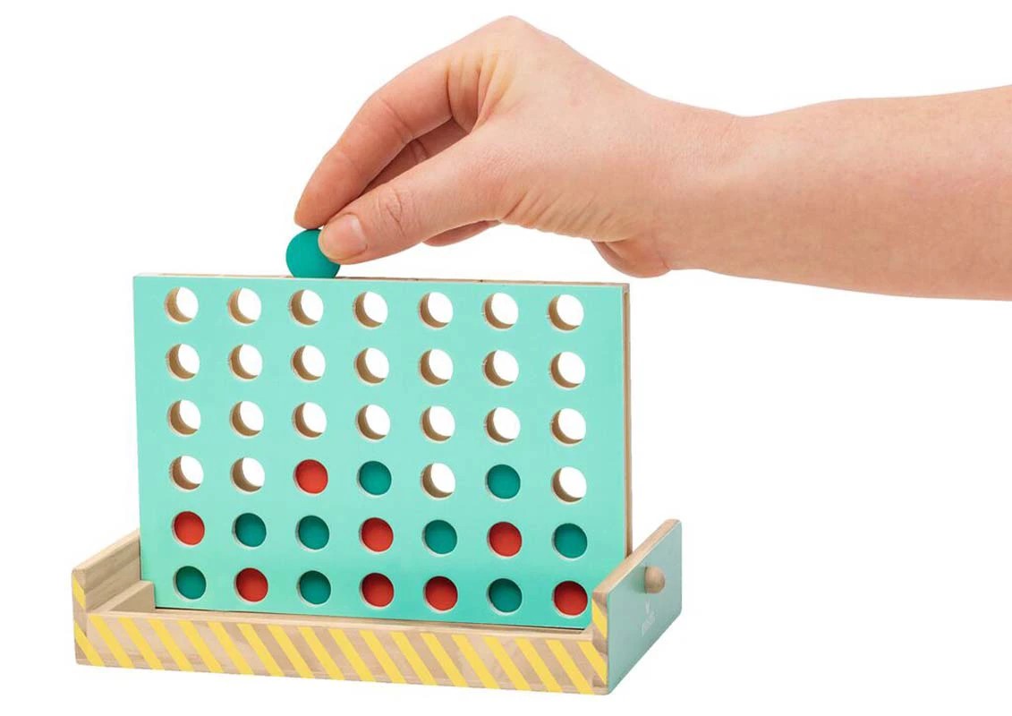Wer gewinnt mit 4? Der schöne Spieleklassiker ist im handlichen Format nicht nur für zu Hause, sondern auch für unterwegs geeignet. Das Spiel und alle Bestandteile bestehen aus Holz, was das beliebte Spiel besonders hochwertig im Vergleich zu den herkömmlichen Varianten aus Plastik erscheinen lässt. Nach dem Spielen lässt sich das blaue Spielgitter im Handumdrehen wieder zusammenklappen und mit einem praktischen Klettverschluss verschließen. So sind auch die kleinen Spielsteine sicher verwahrt und das Spiel kann ganz einfach in der Tasche oder dem Koffer transportiert werden. Ideal nicht nur fürs Kinderzimmer, sondern auch eine gute Kinderbeschäftigung für den Ausflug in den Park oder die nächsten Familienferien!